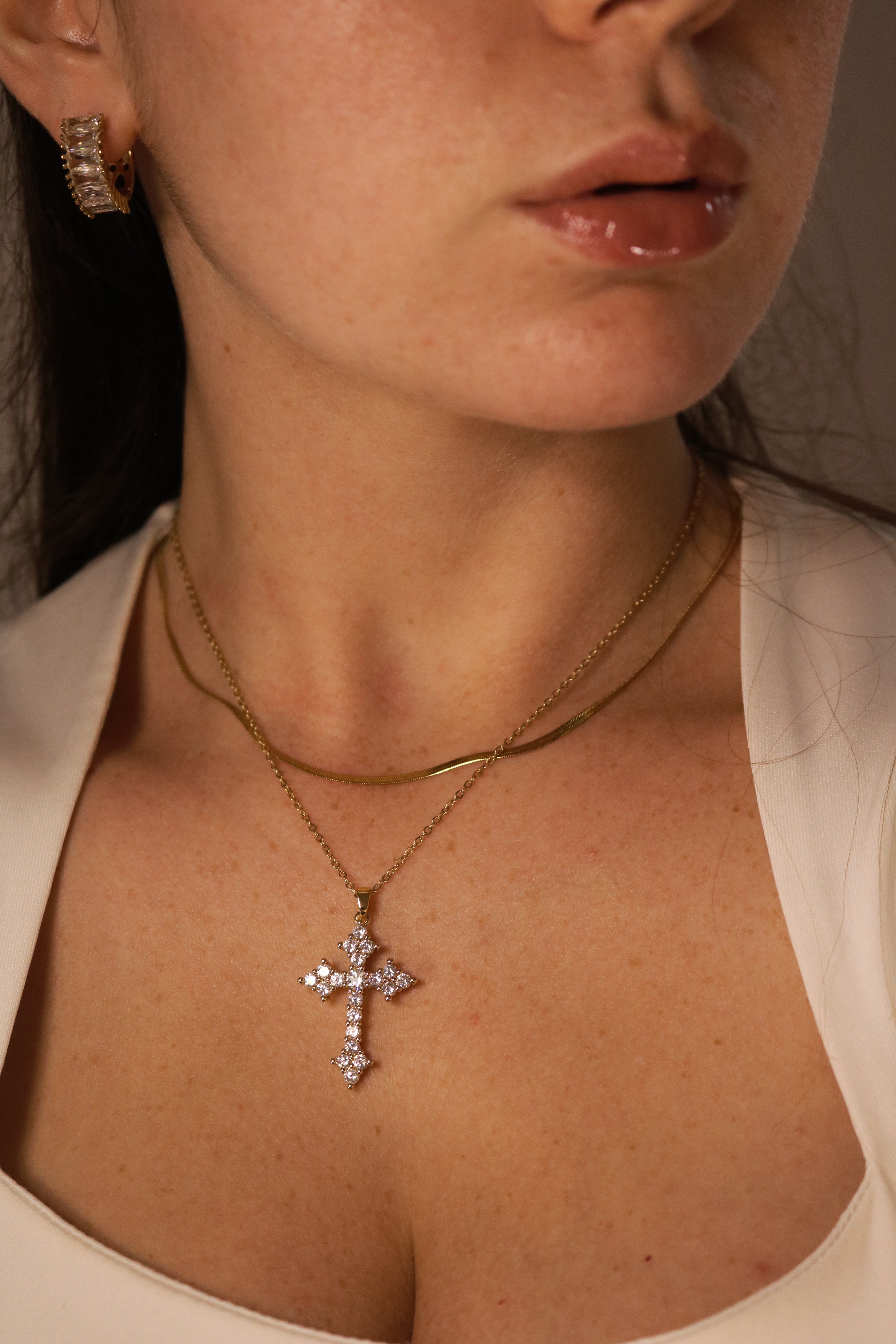 Colar com cruz em zircónias brancas, uma peça moderna e brilhante que acrescenta impacto imediato a qualquer look. As zircónias garantem um brilho intenso, tornando este colar a escolha ideal para quem procura um acessório marcante, versátil e cheio de estilo.
