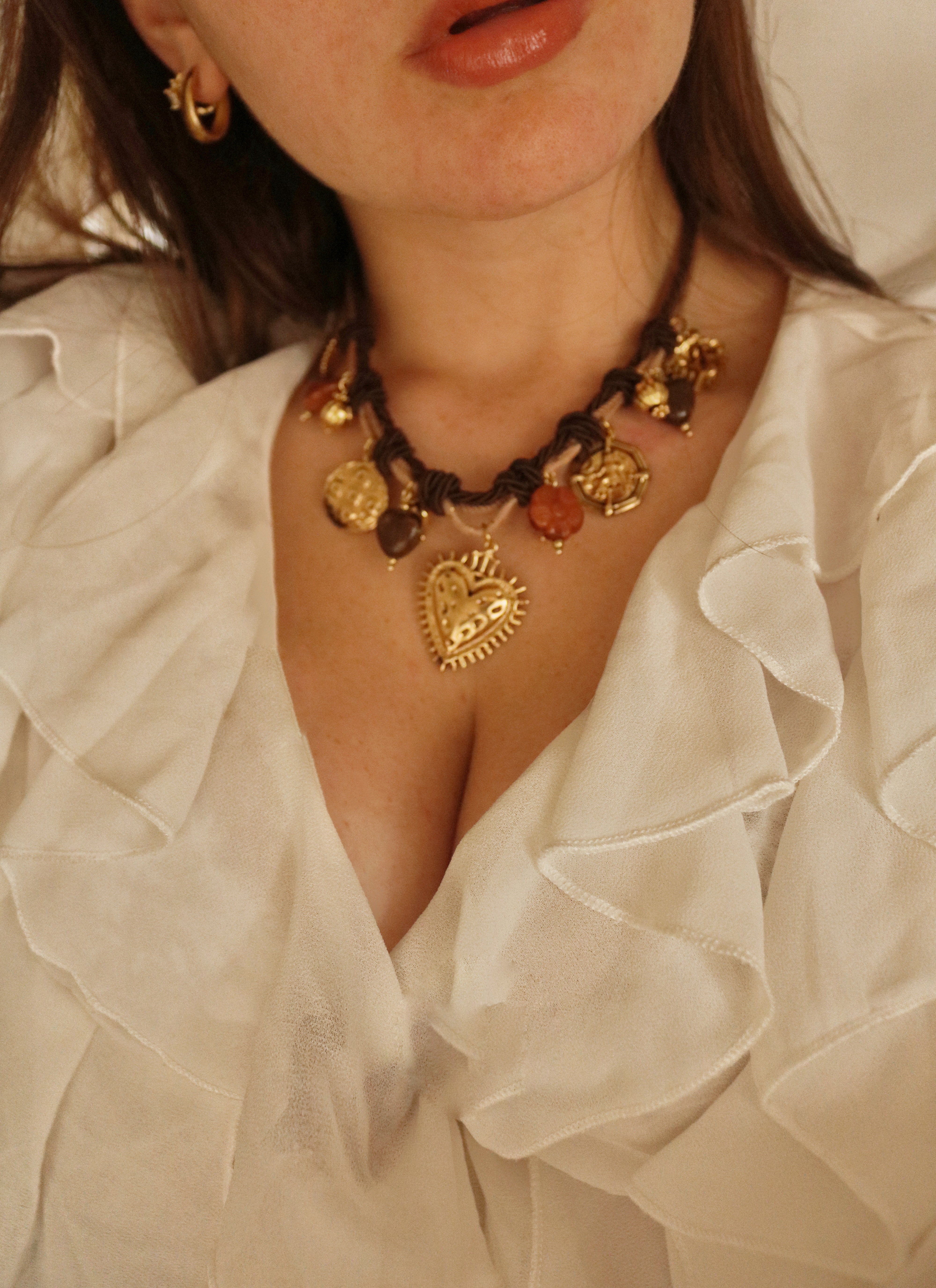 Uma fusão moderna entre a textura da corda e o brilho dos charms dourados. O Colar Orya é a peça ideal para elevar o seu visual com simplicidade e personalidade.