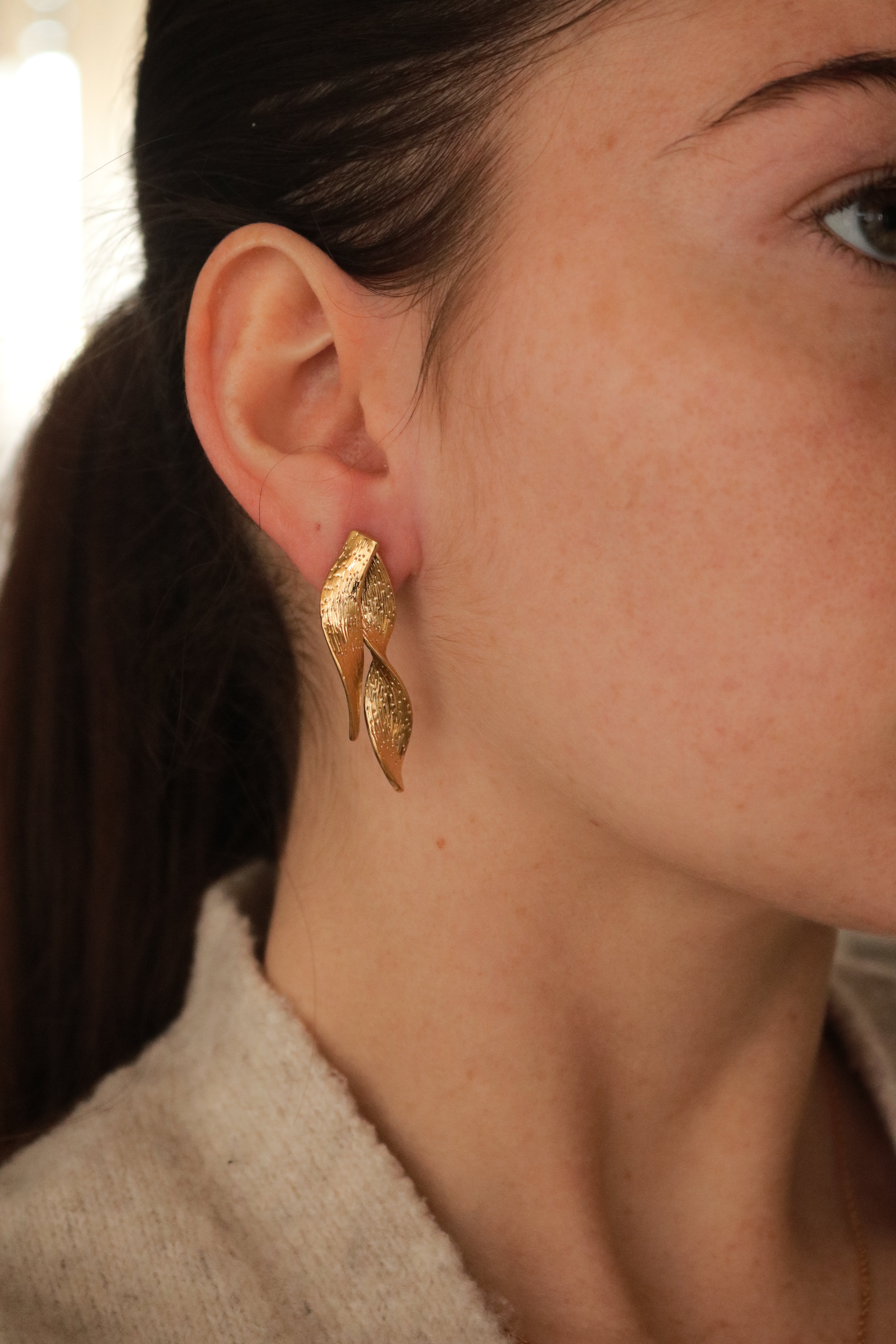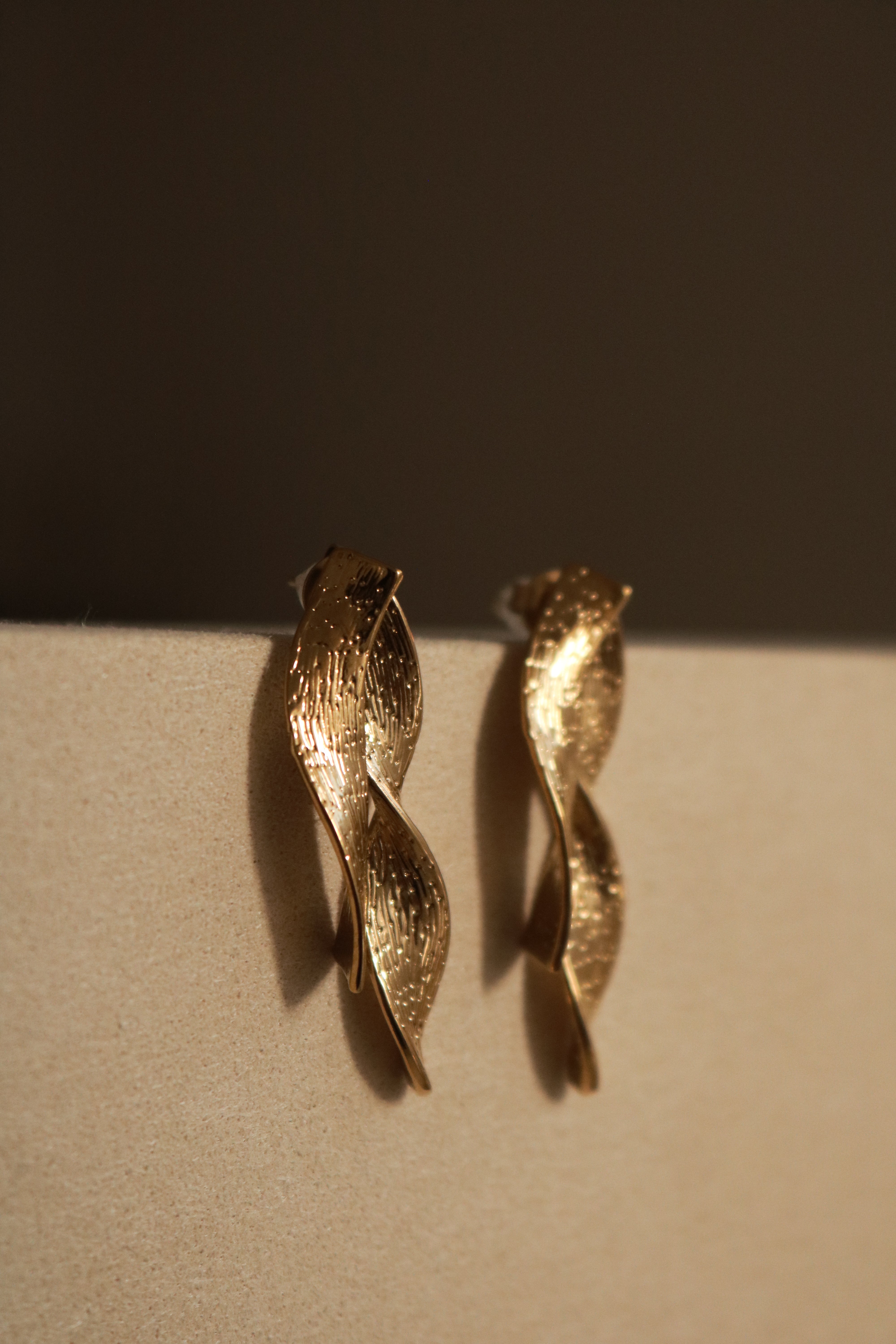 Os Brincos Cleo apresentam um design moderno e orgânico em dourado, criando um brilho subtil e sofisticado. Leves, elegantes e versáteis, são perfeitos para elevar qualquer look.