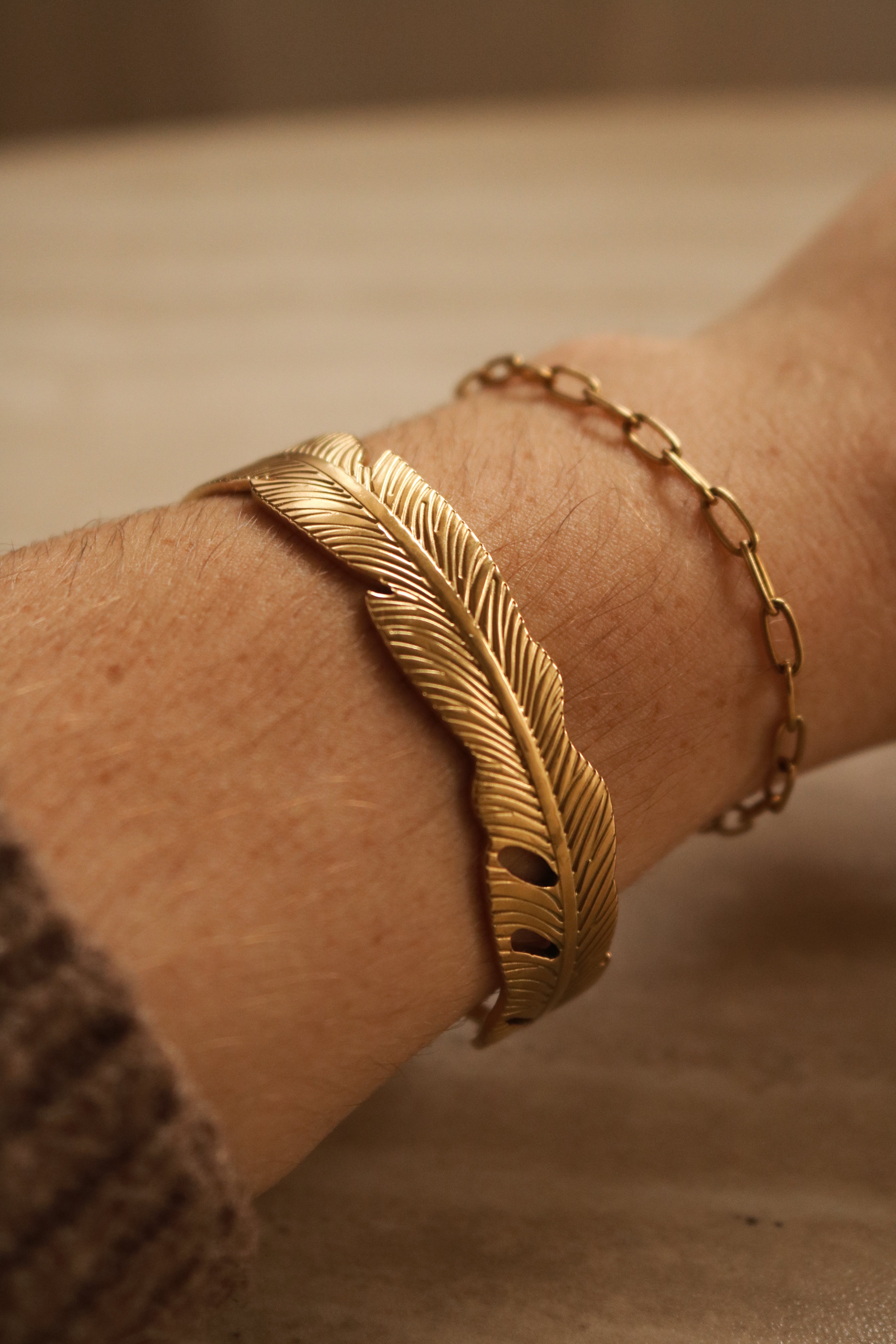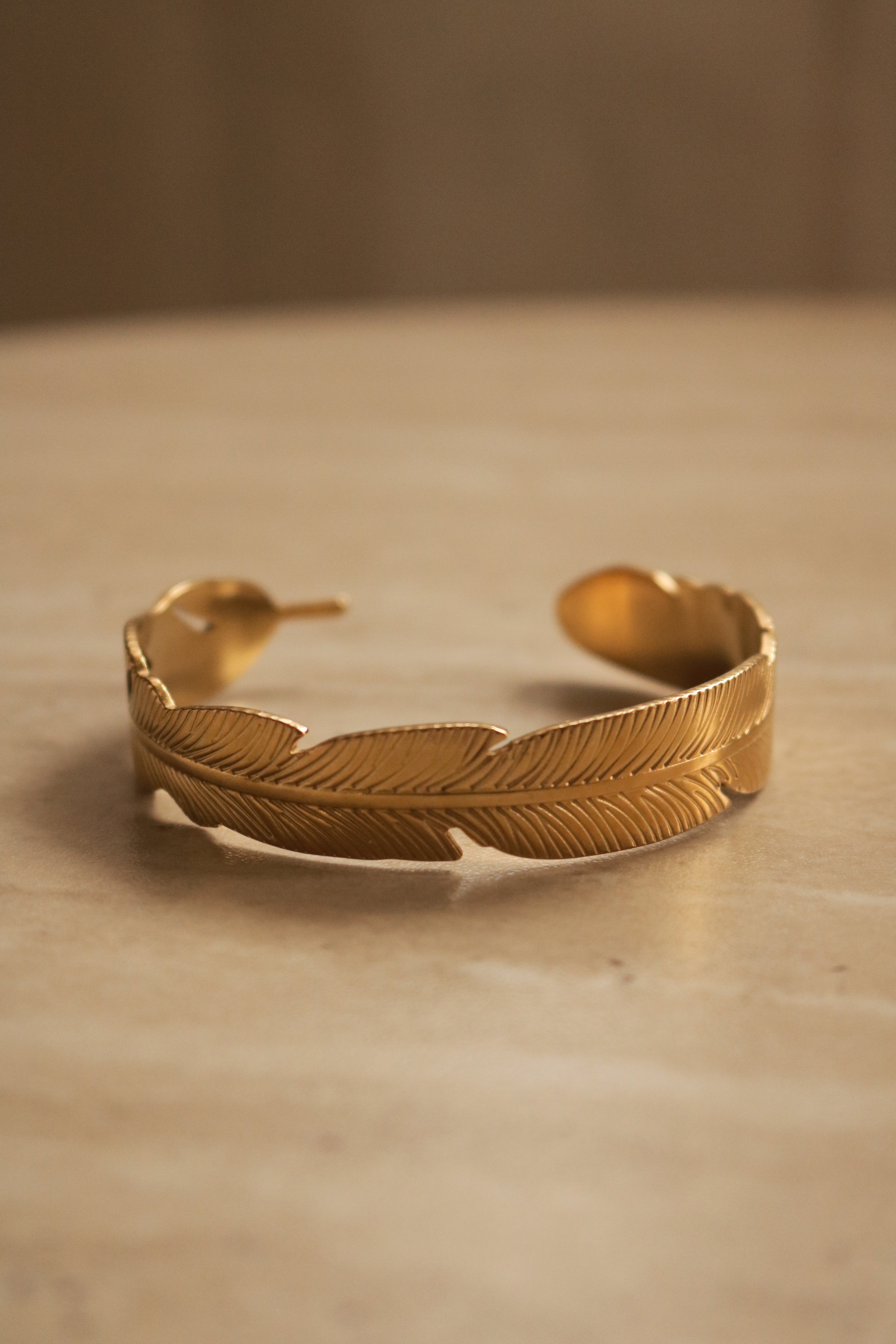 A Pulseira Feather destaca-se pelo design orgânico e leve, inspirado na fluidez de uma pena. Com acabamento dourado, é uma peça moderna e elegante, perfeita para adicionar brilho e sofisticação a qualquer look.