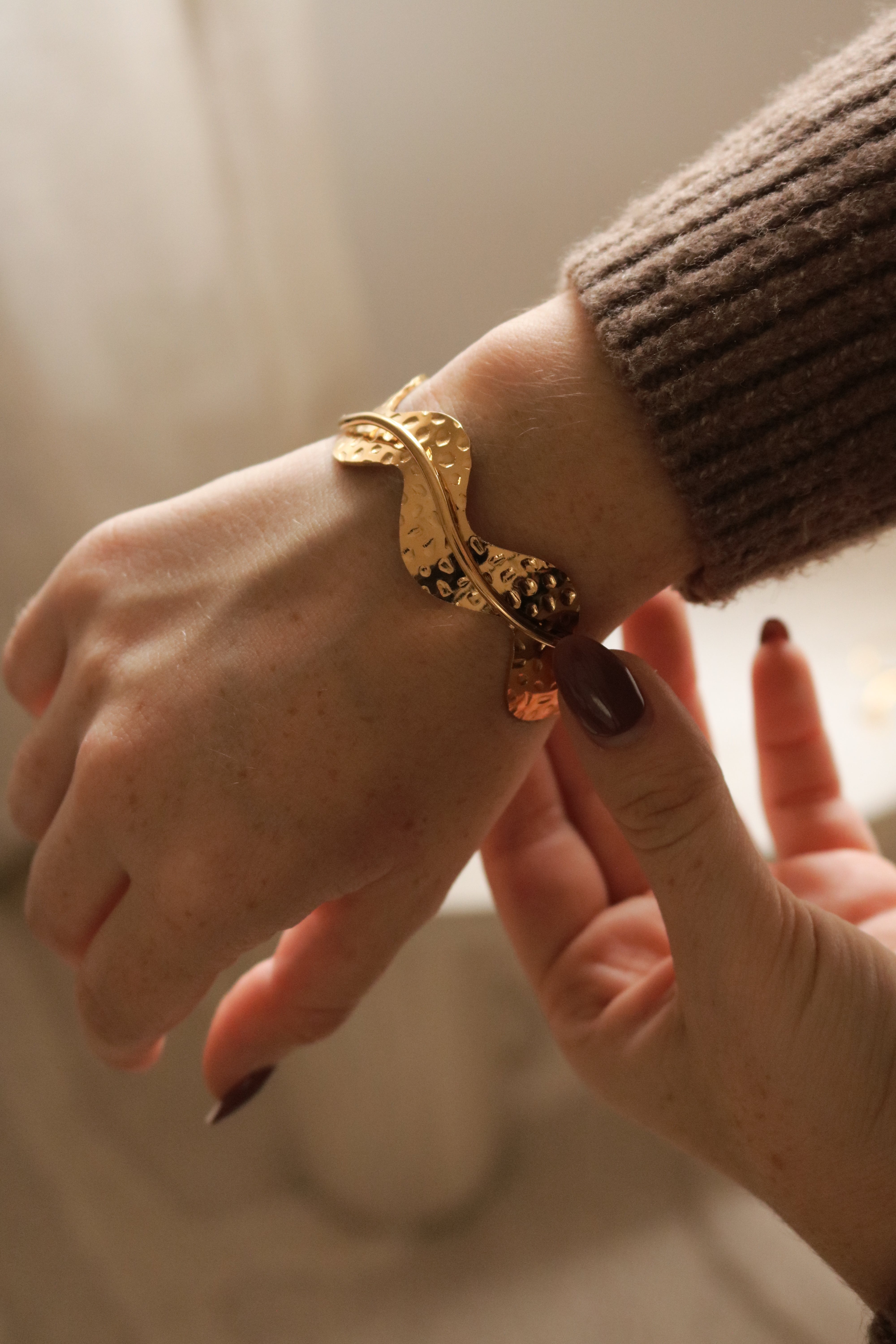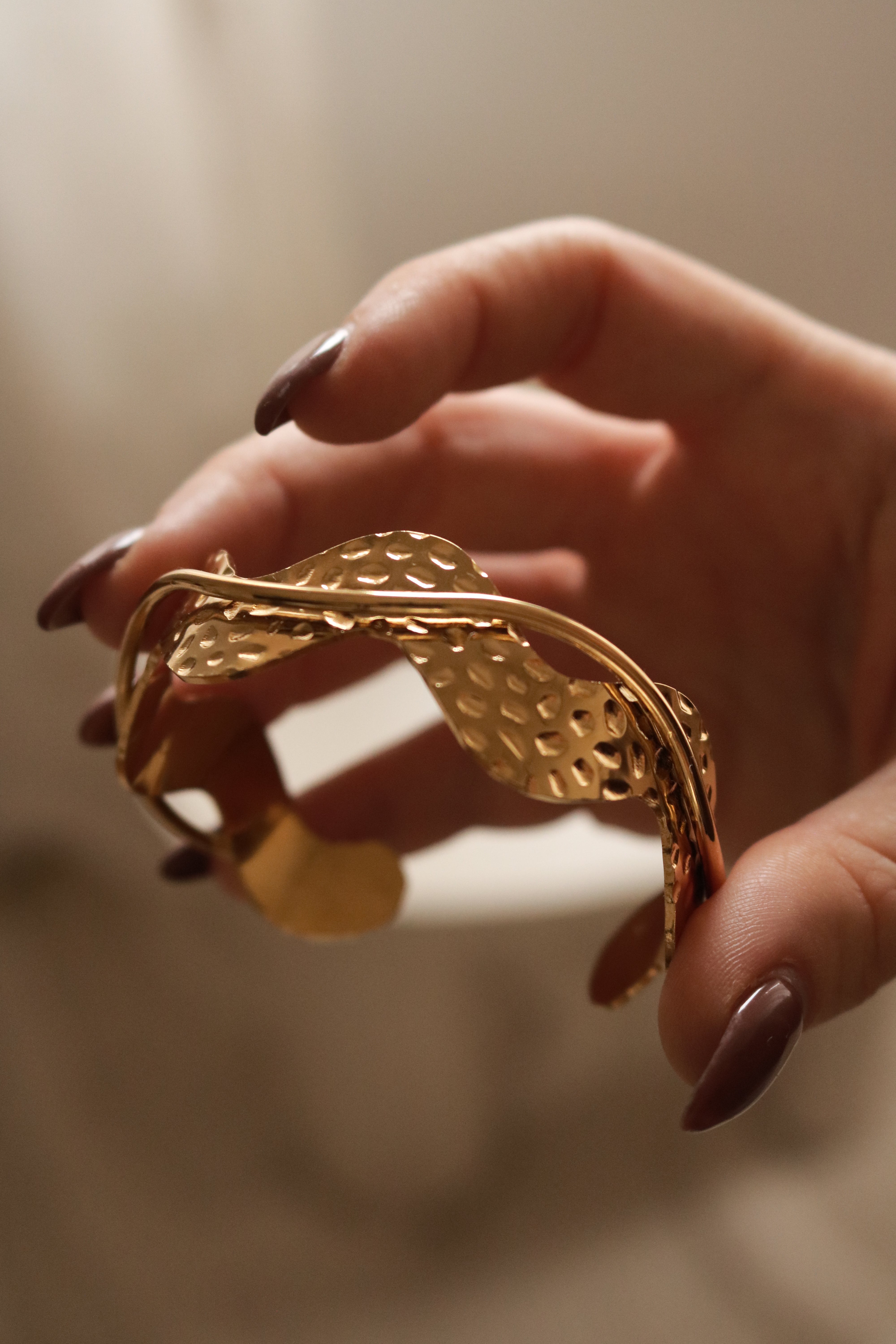 A Pulseira Wave destaca-se pelo seu design ondulado e elegante, com textura martelada que capta a luz de forma única. O acabamento dourado e a forma fluida tornam esta peça moderna e sofisticada — perfeita para dar um toque artístico e distinto a qualquer look.