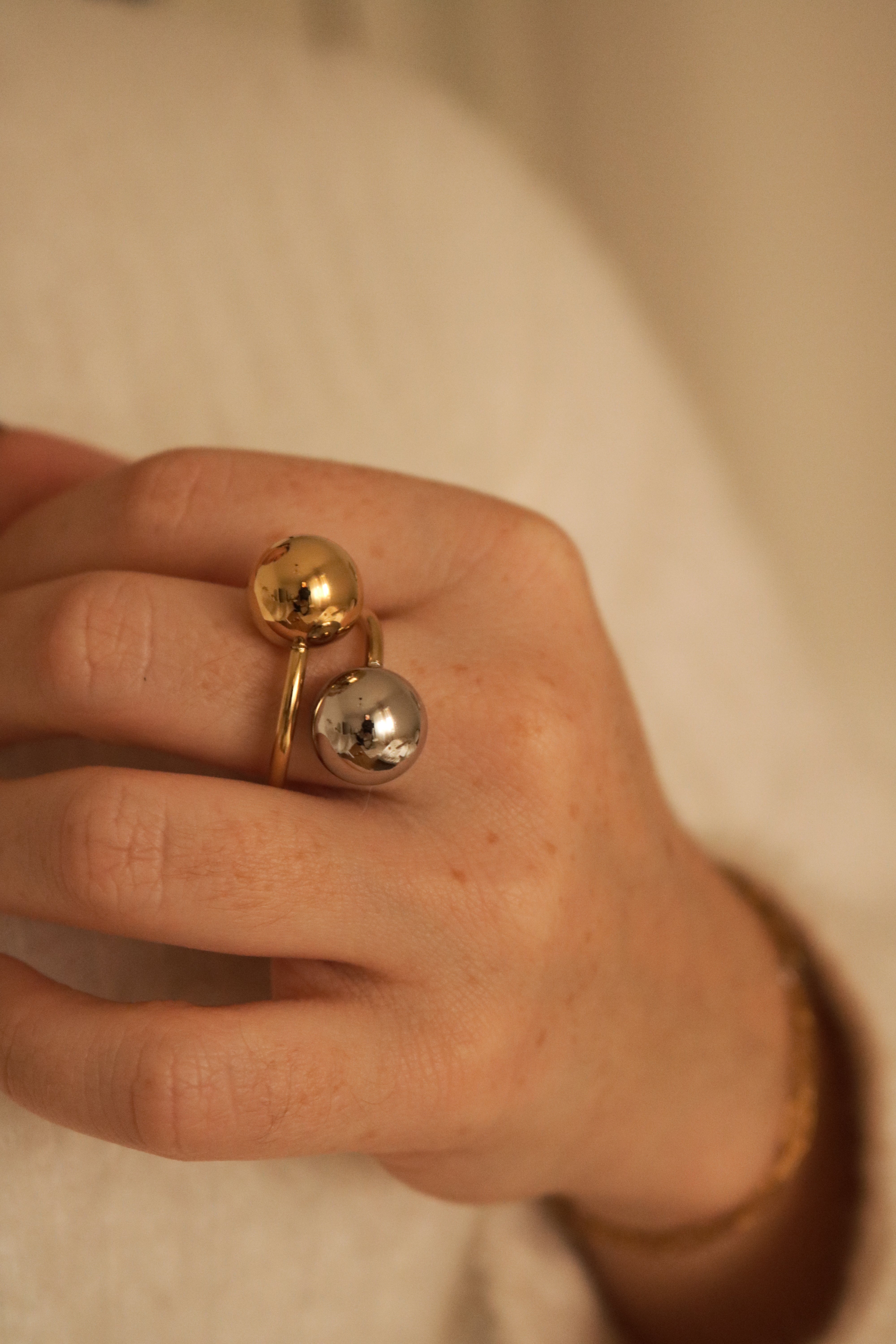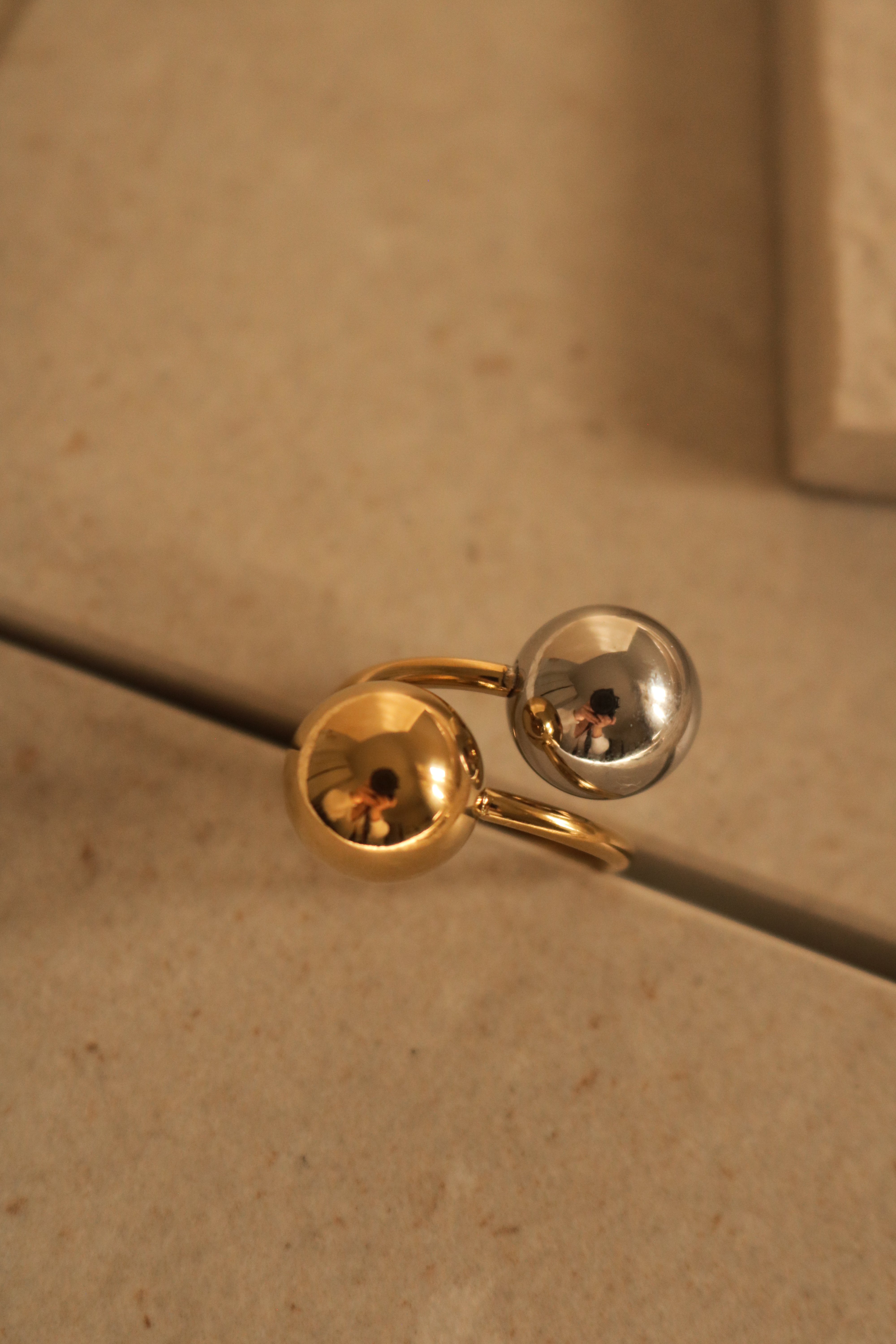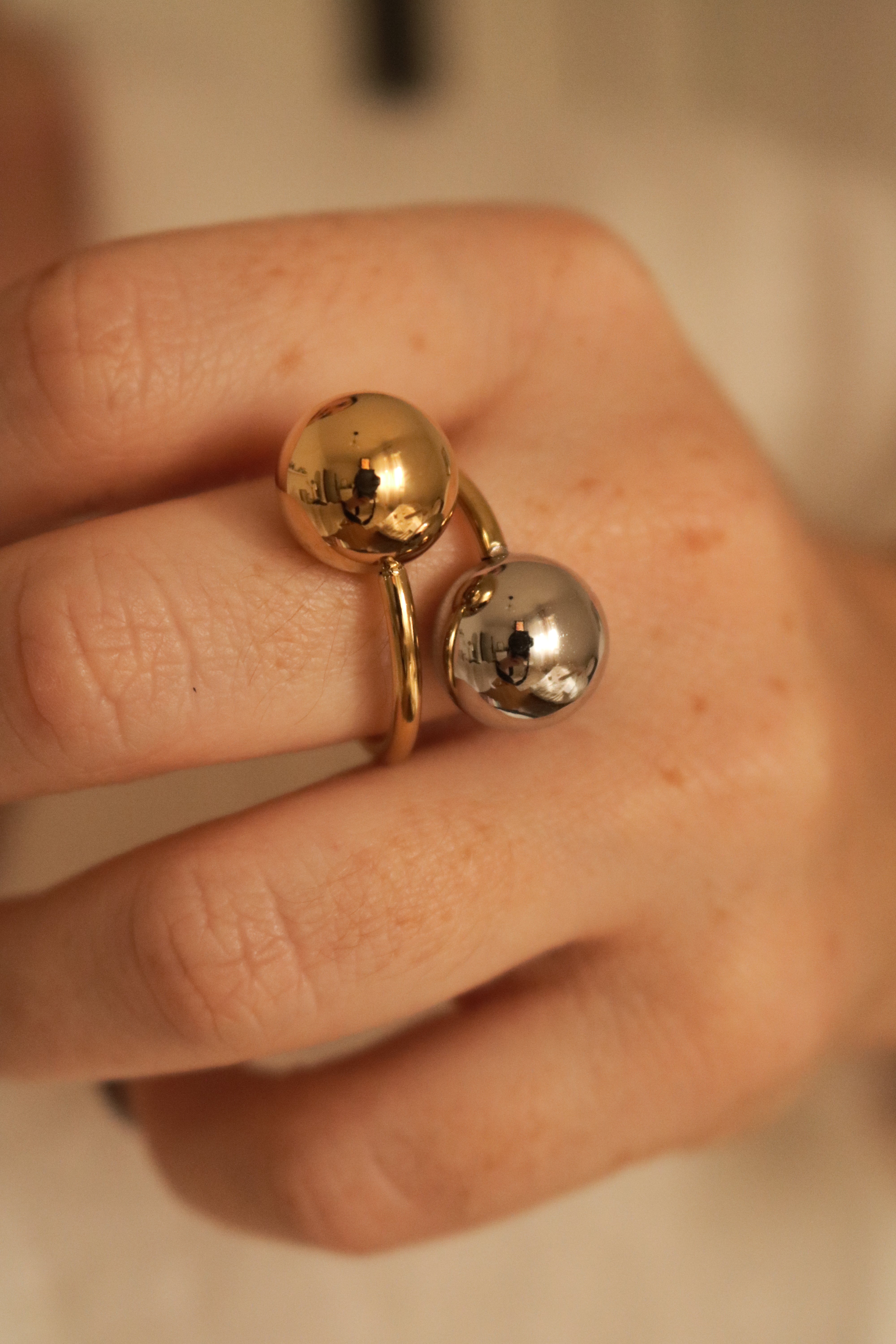 O anel Fusion combina dourado e prateado num design moderno com duas esferas em destaque. Feito em aço inoxidável e ajustável, oferece conforto, durabilidade e um toque ousado a qualquer look.
