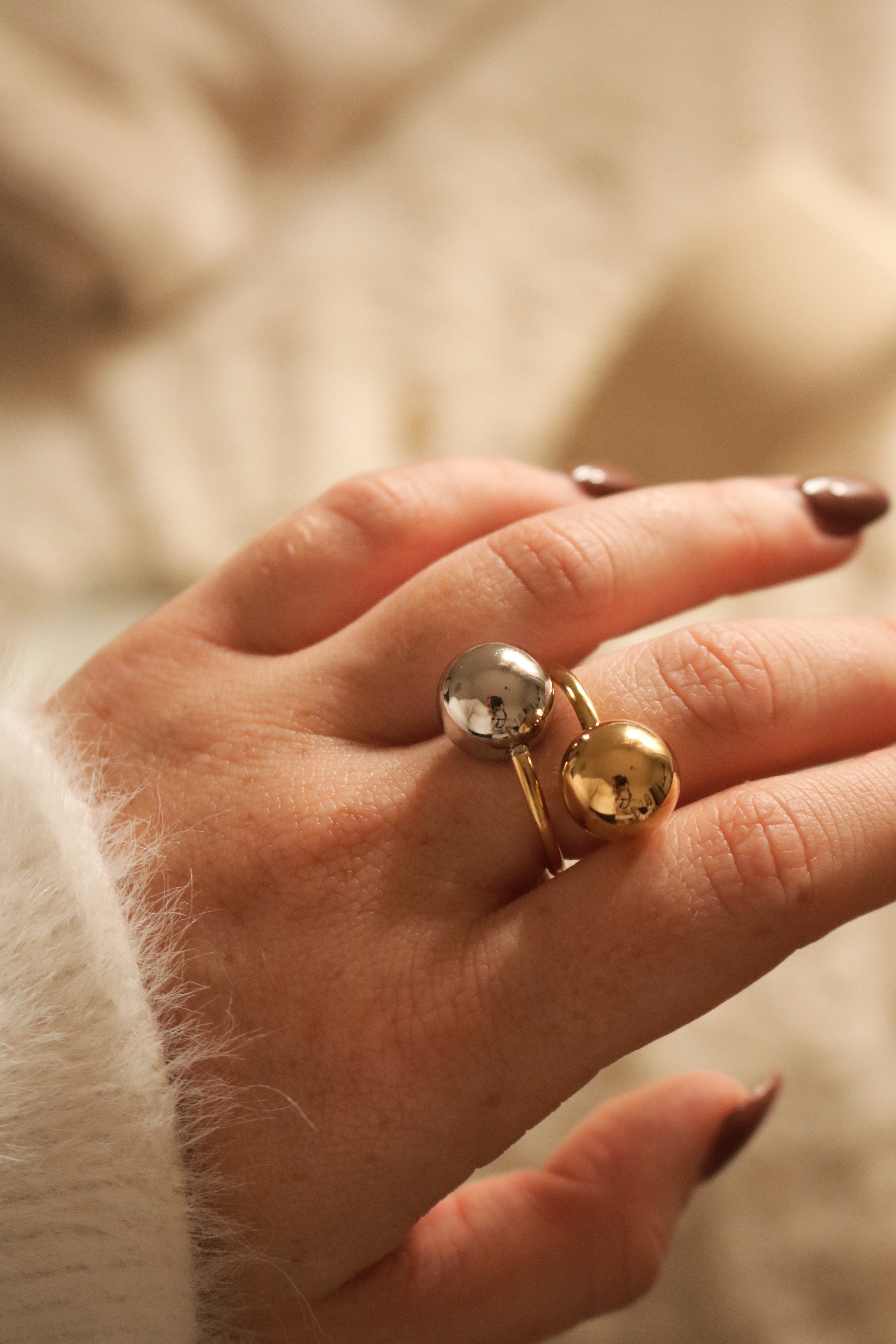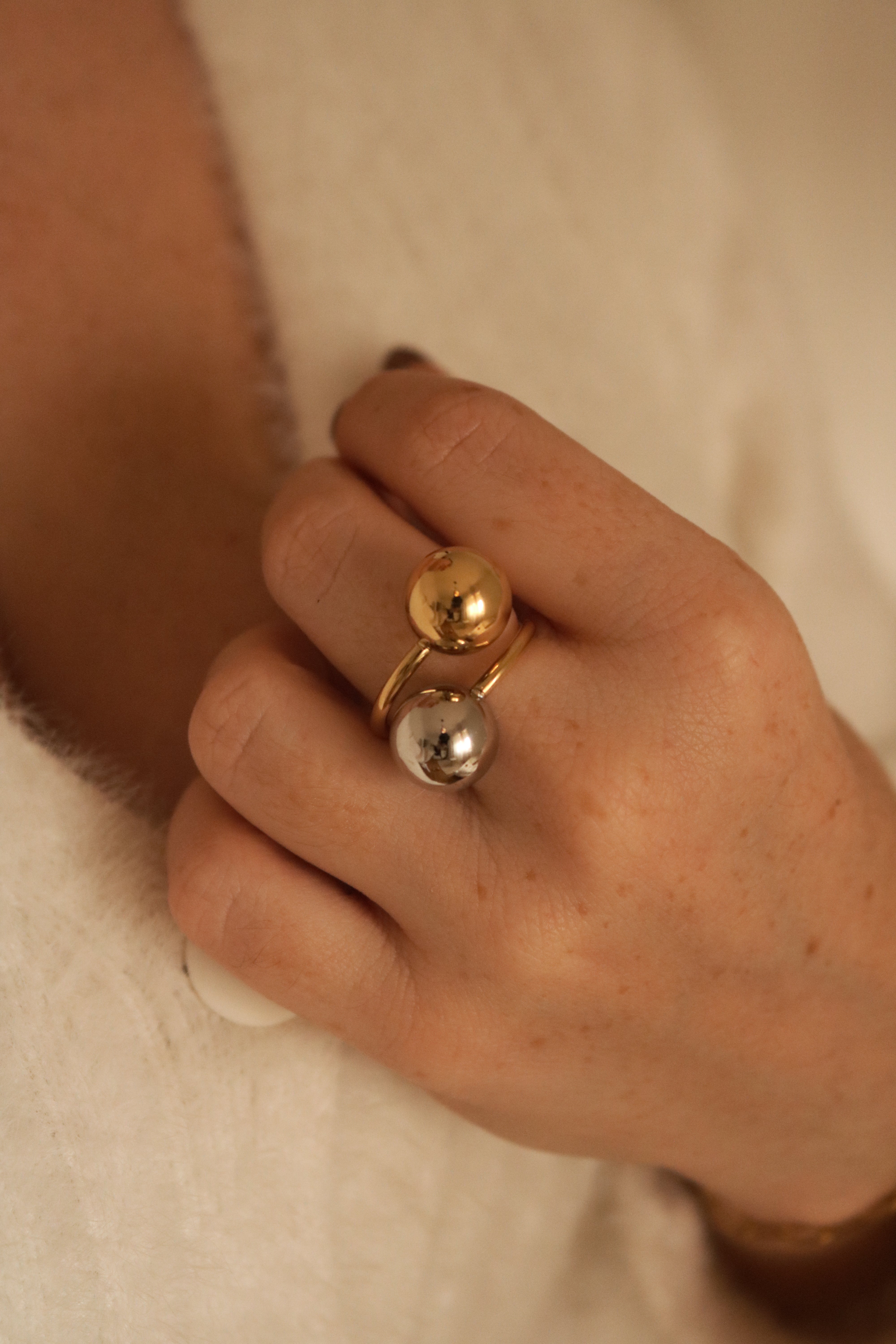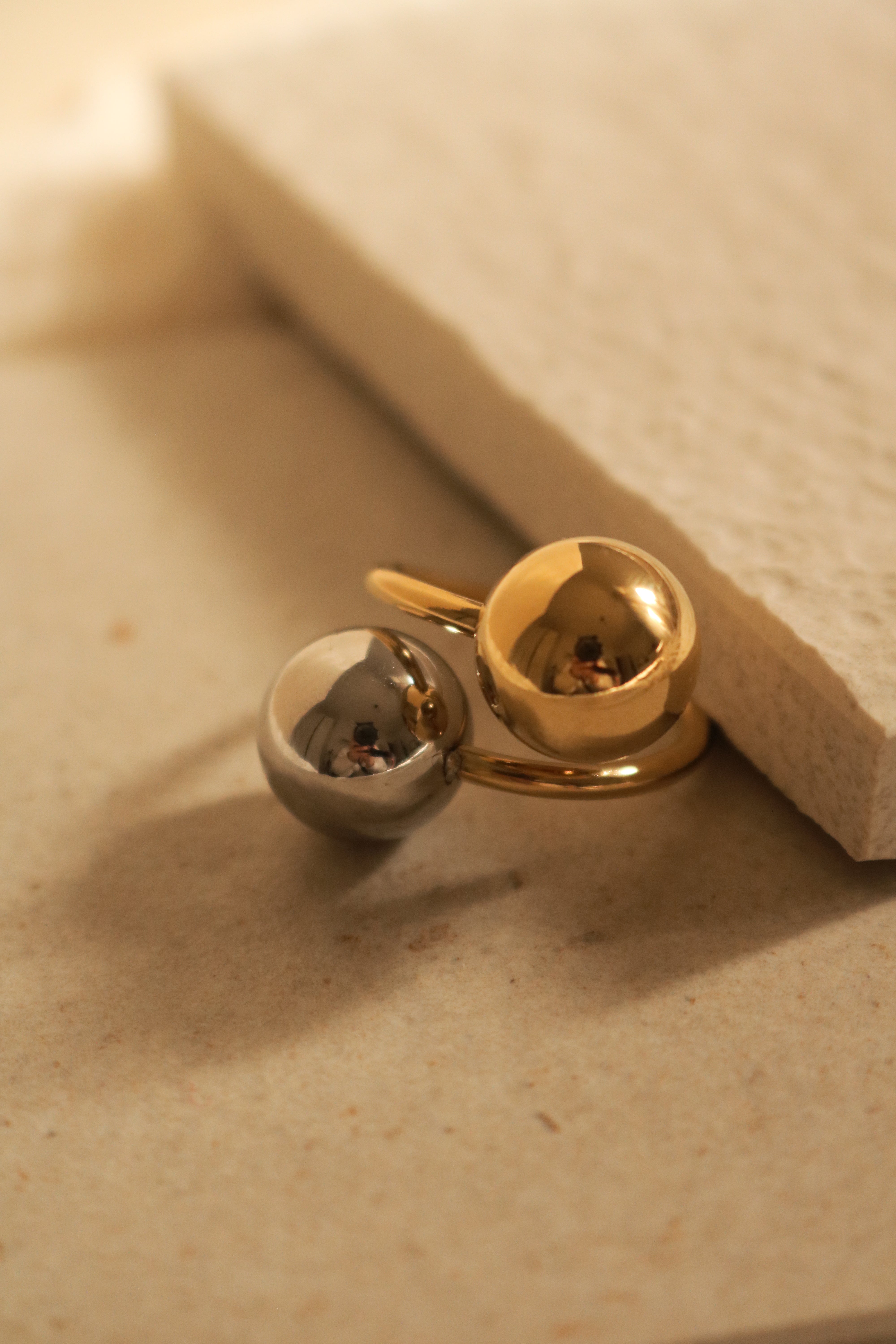 O anel Fusion combina dourado e prateado num design moderno com duas esferas em destaque. Feito em aço inoxidável e ajustável, oferece conforto, durabilidade e um toque ousado a qualquer look.
